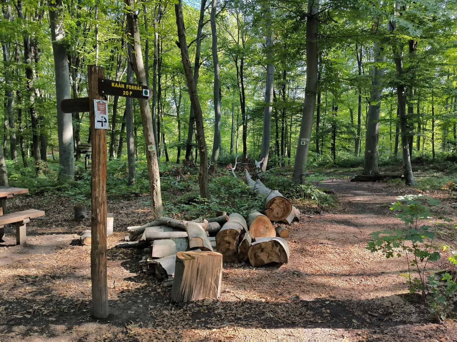Mi Pilisszentlászlóról visszafelé a Jenő kunyhónál megpihentünk egy kicsit, majd elhagytuk a zöld sáv jelzést és a zöld körön haladtunk egészen a Kaán-forrásig. Ez az útvonal először elég elhagyatottnak tűnhet, de a dús növényzet ellenére jól járható és lehetetlen eltévedni.
