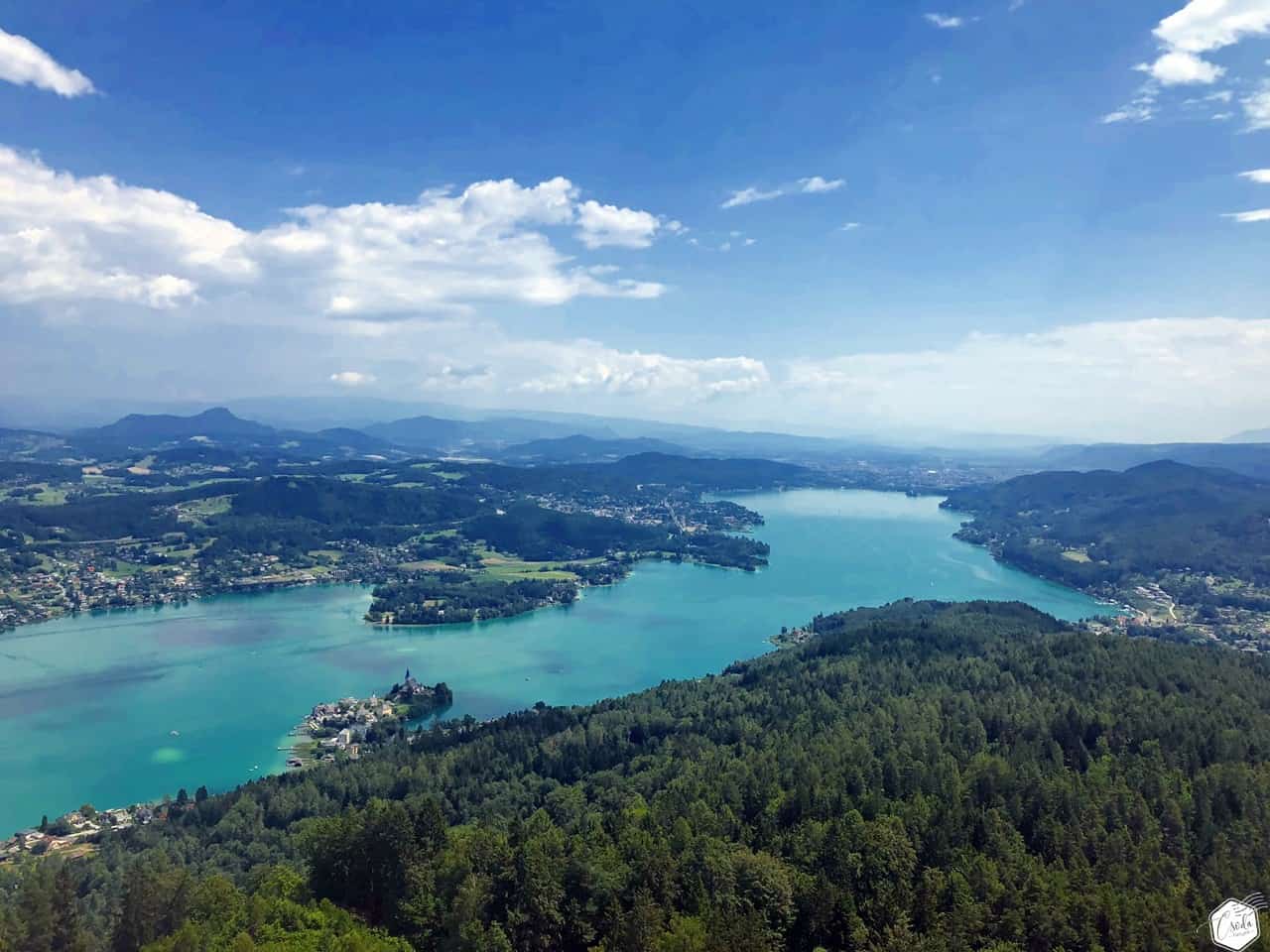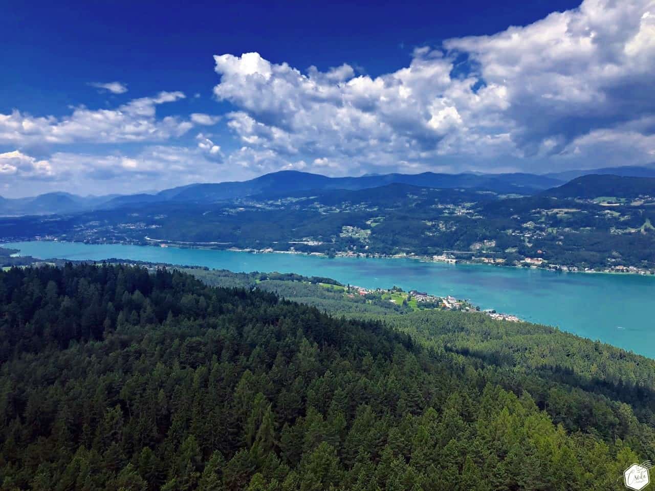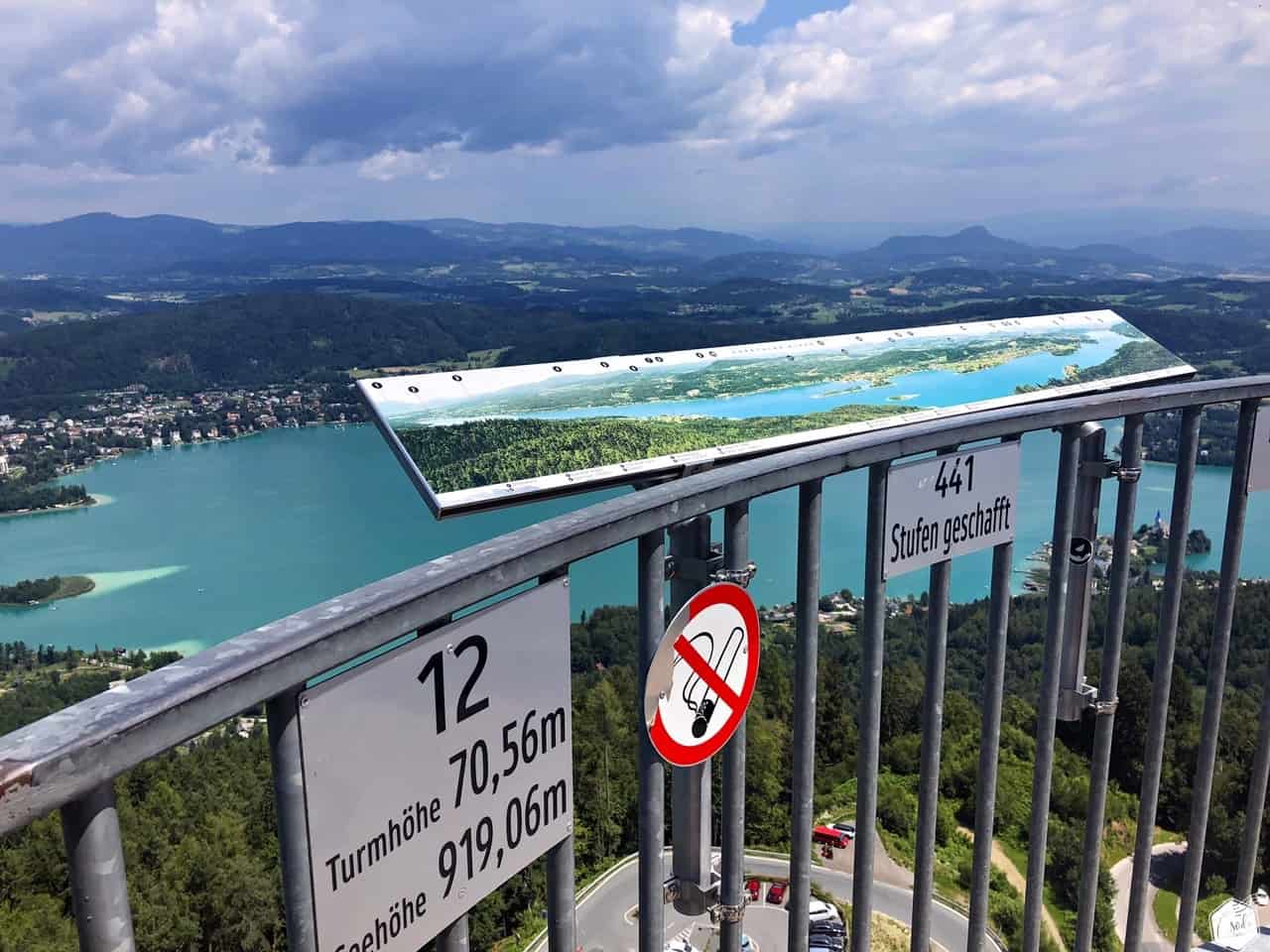 Szinte teljes nagyságában láthatjuk innen a türkizkék vizű Wörther See-t, délen a Keutschacher See-t és a Karavankák hegyláncait. Ha pedig elvesznénk a hegyek látványában, bátran vegyük igénybe a tájékozódást segítő információs táblákat.